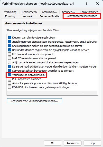 - Selecteer het tabblad Geavanceerde instellingen en zet het vinkje bij Verificatie op netwerkniveau.