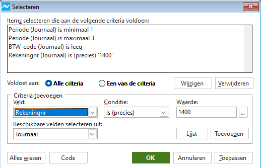 Mochten er na deze selectie nog boekingen in het venster staan, dan zijn dit boekingen met een onjuiste btw-code. Deze boekingen kunt u controleren en zo nodig wijzigen.