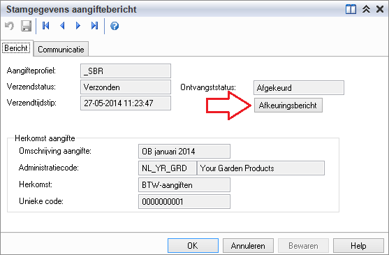 De status Klaar voor verzending kan ook ontstaan als er een probleem is bij het versturen van de aangifte. De aangifte is dan wel klaargezet in het venster Aangifteberichten, maar omdat de verzending niet gelukt is zal deze hier op status Te verzenden blijven staan. Open in dit laatste geval de stamgegevens van dit bericht (F6) en bekijk de tab Communicatie. Daar zult u de melding terugvinden die verklaart waarom het bericht is afgekeurd.